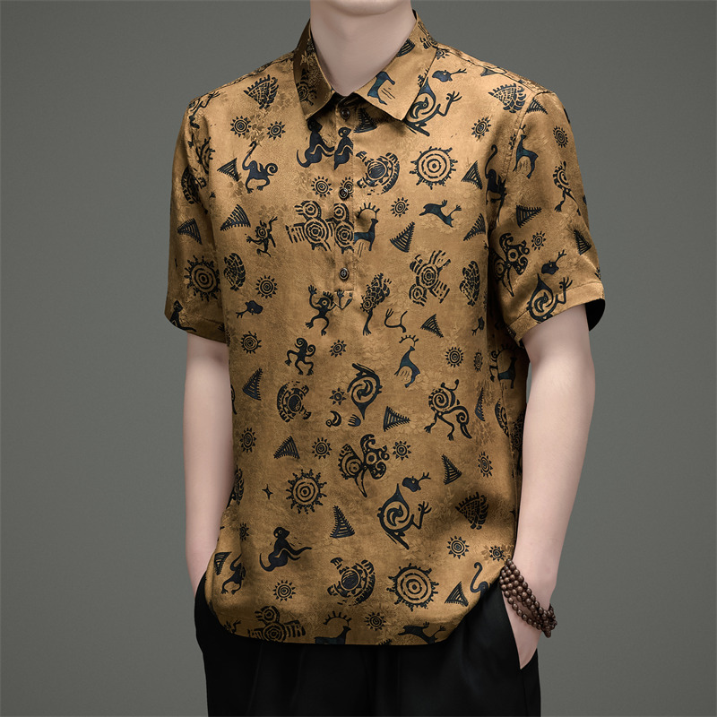 香云纱重磅提花短袖衬衫男士休闲时尚桑蚕丝短袖衬衫